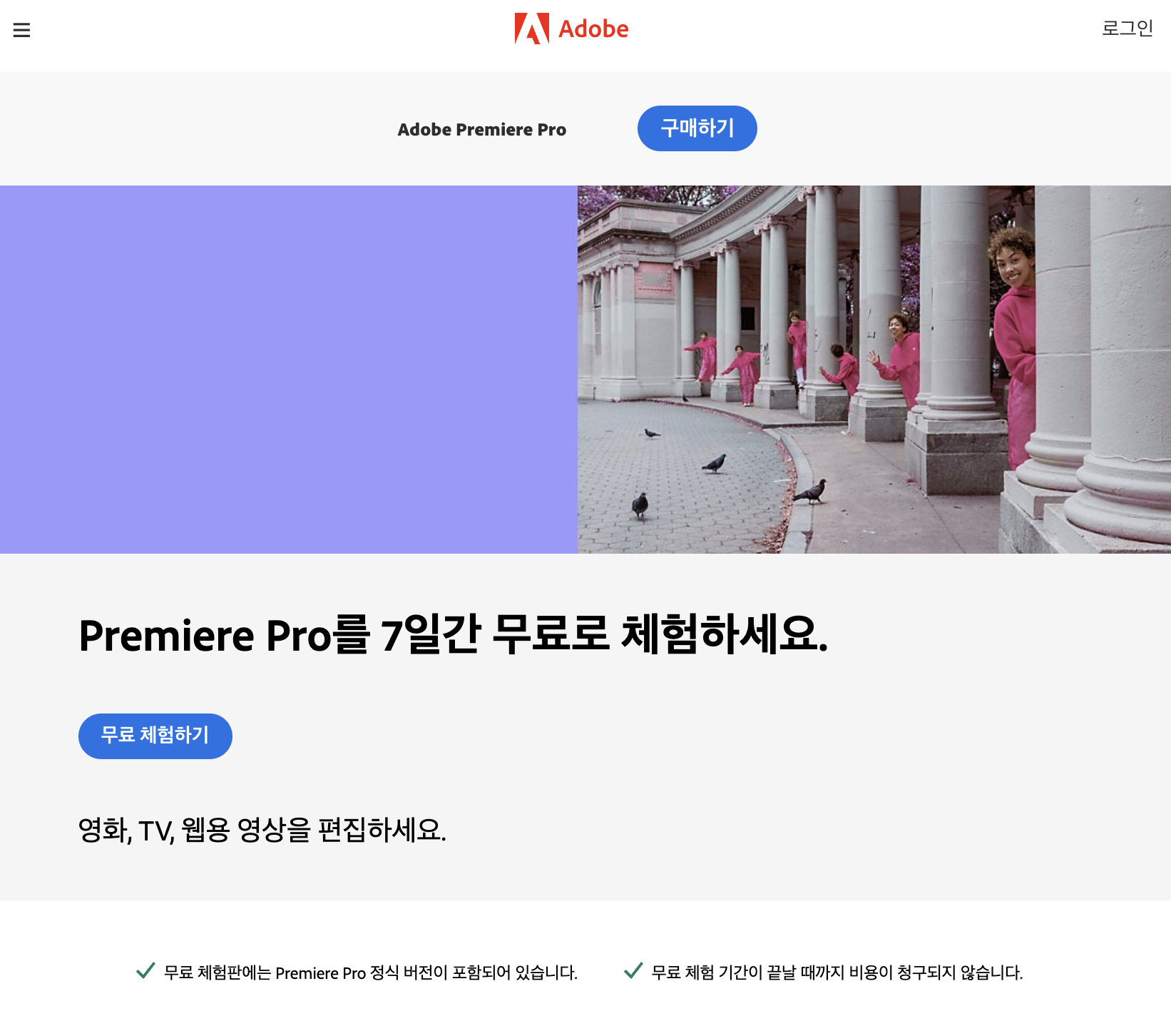 어도비 프리미어 프로의 경우는 영상편집 소프트웨어의 끝판왕이라고 할 수 있을 정도의 프로그램이며 실제로 필드에서도 많은 전문가들이 직접 사용하는 프로그램이다. 이 프로그램은 평생 무료는 아니며, 약 7일이라는 기간에 대해 무료로 체험할 수 있는 시간이 주어진다.